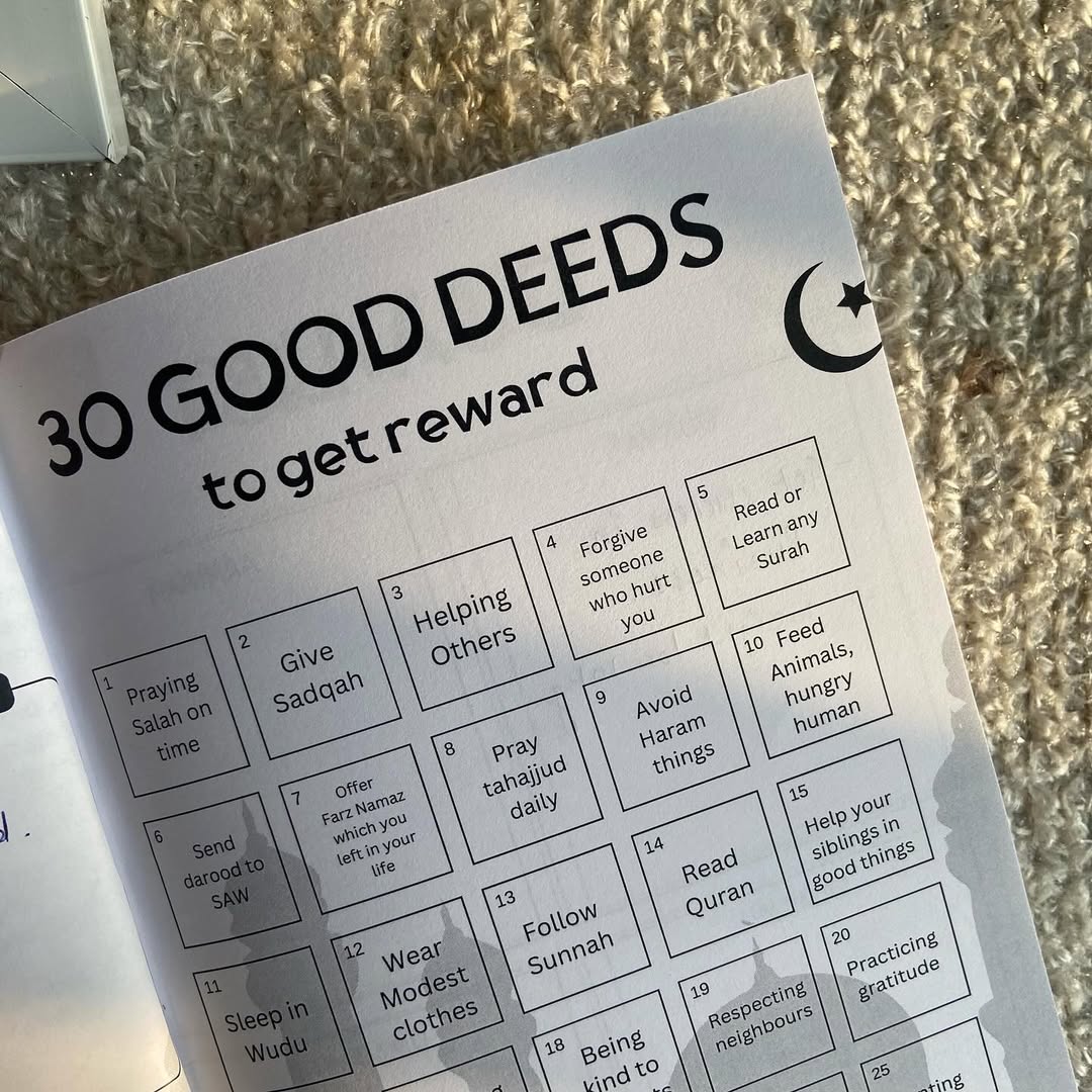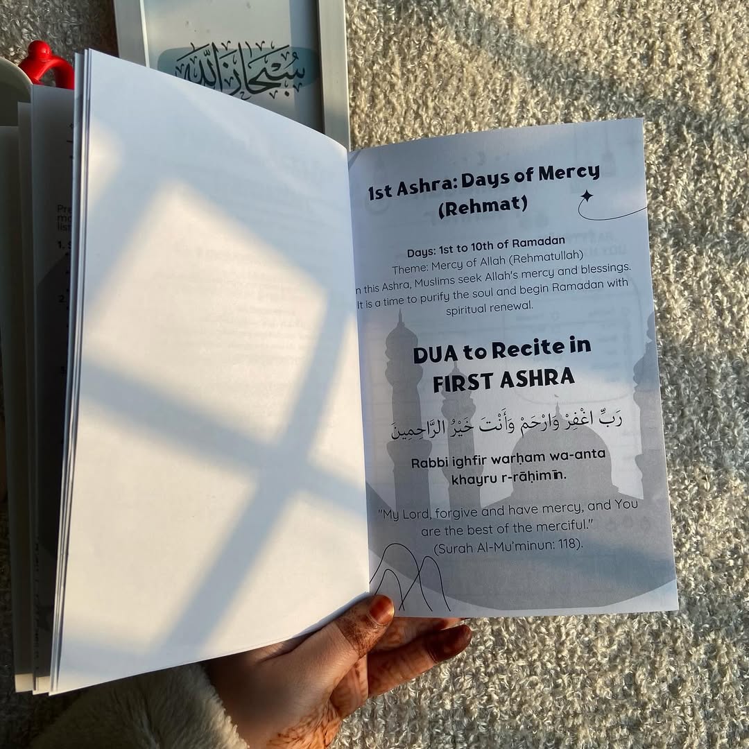 The planner includes Ramadan preparation pages, Ashra duas, daily planning pages for all 30 days, a 12-month Salah tracker, Tarawih tracker, good deeds tracker, and notes pages for reflections. Printed on 90 GSM premium quality paper, this Ramadan planner also comes with a freebie.